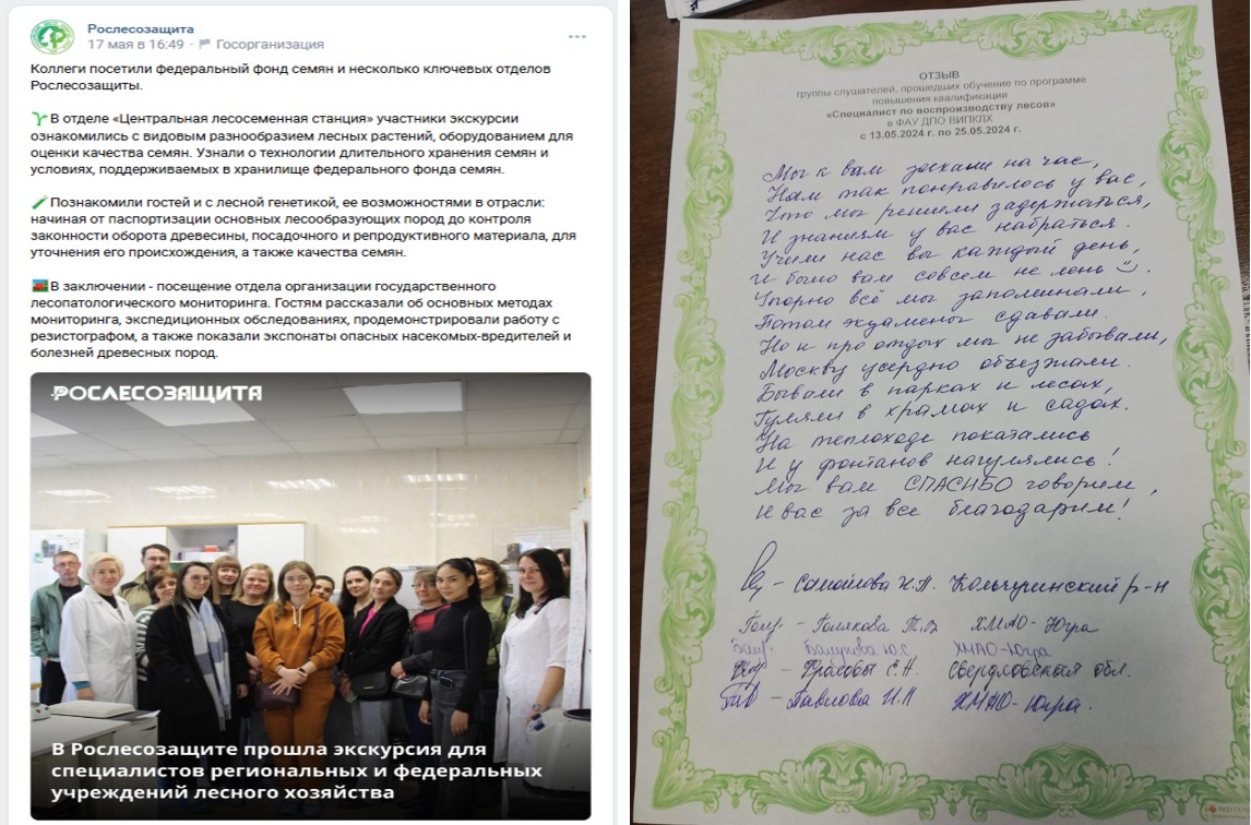 Во время выездных занятий на лесные объекты слушатели посетили лесной питомник, лесные участки с проведёнными мероприятиями по лесовосстановлению с целью оценки приживаемости лесных культур, отнесения земель, к землям на которых расположены леса.