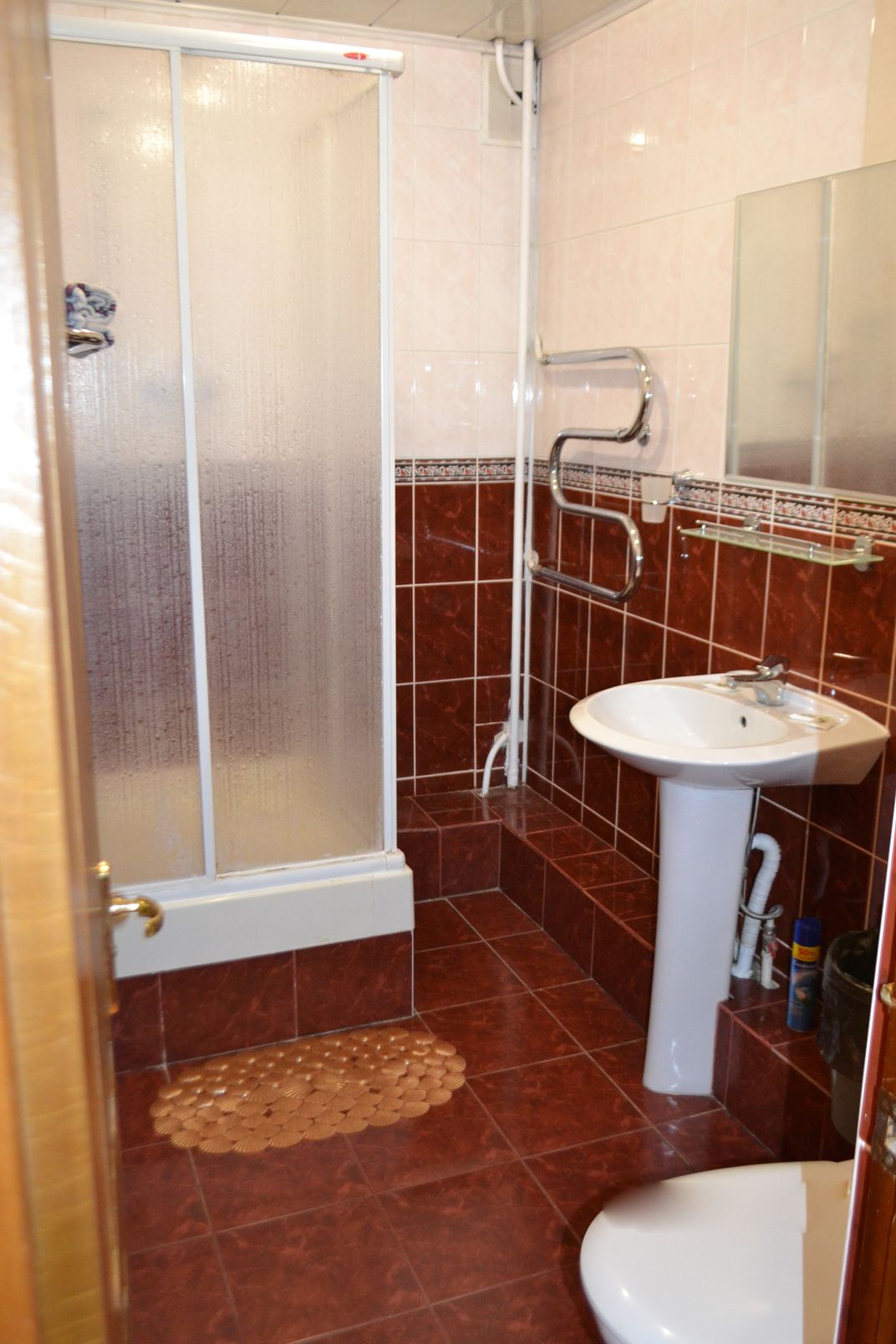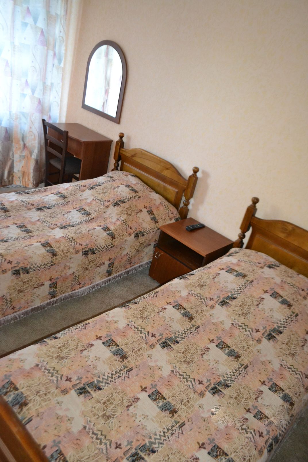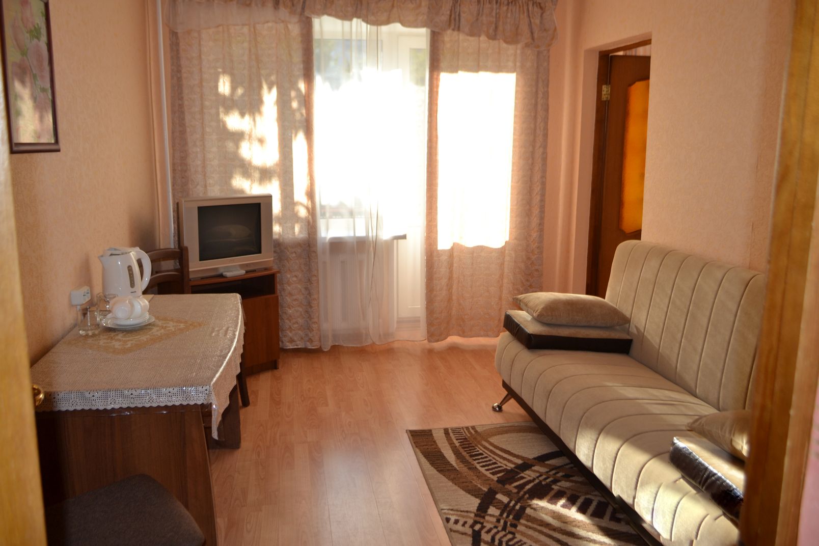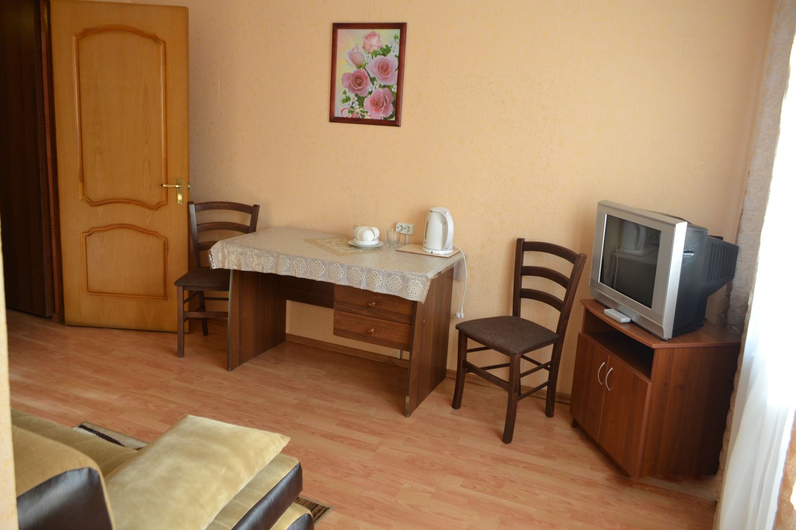 1 категория – двухкомнатный номер Номер с балконом площадью 31,9 м, состоящий из 2-х комнат, ванной комнаты с душем и туалетом. Номер включает в себя 2 односпальные кровати, диван, 2 тумбочки, шкаф ,письменный стол, стулья, телевизор, холодильник, электрический чайник, набор посуды.