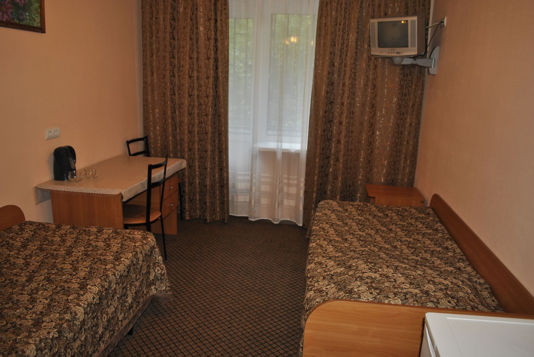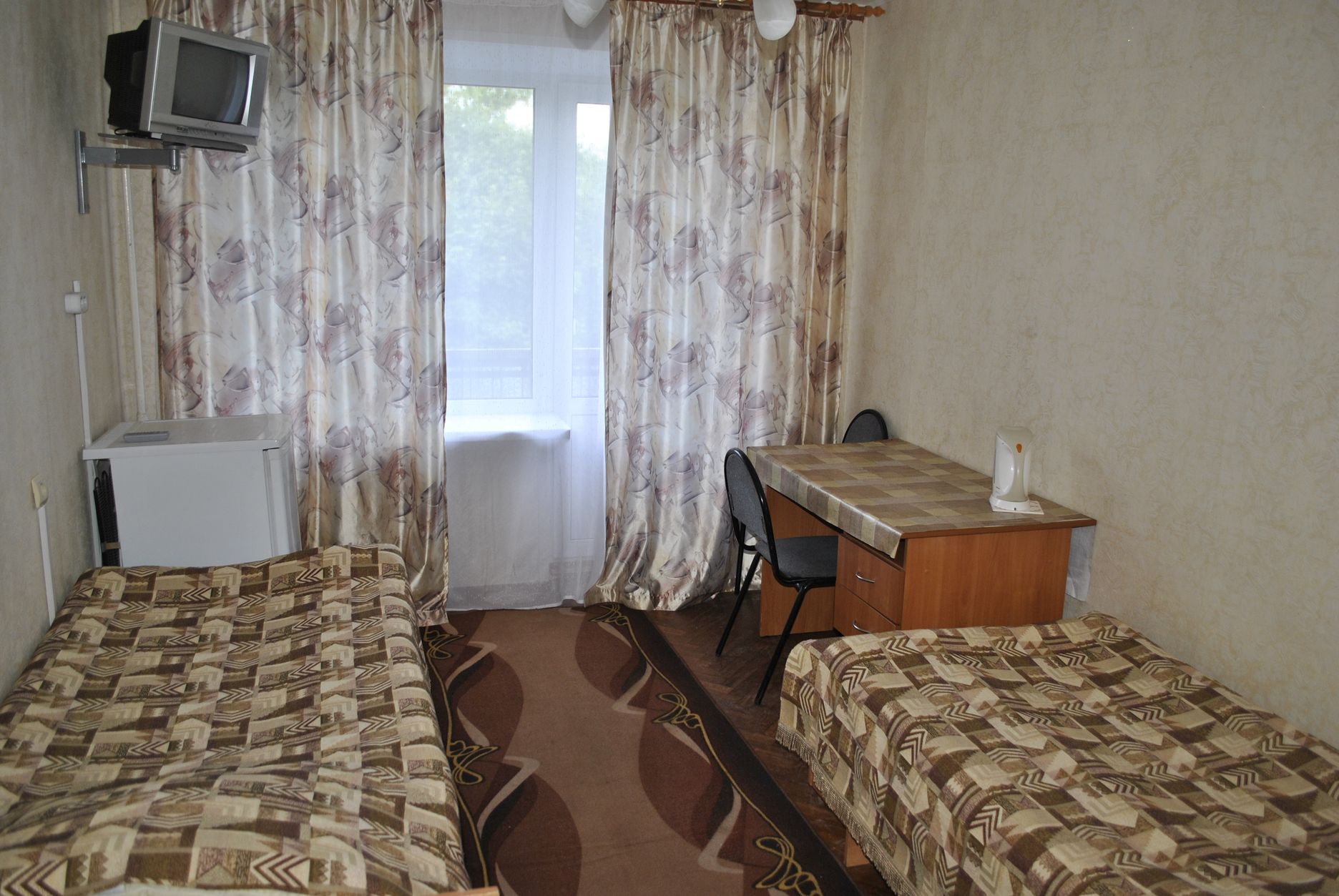 2 категория – однокомнатный номер с частичными удобствами Номер с балконом площадью 15,8 м, состоящий из 1 комнаты, санузла с раковиной и туалетом. Номер включает в себя 2 односпальные кровати, 2 тумбочки, шкаф, письменный стол, стулья, телевизор, холодильник, электрический чайник, набор посуды.